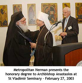 On Thursday evening, February 27, 2003, over 300 people witnessed His Beatitude, Metropolitan Herman, Primate of the Orthodox Church in America and President of Saint Vladimir Orthodox Theological Seminary here, present an honorary Doctor of Divinity degree to His Beatitude, Archbishop Anastasios of Tirana, Durres, and All Albania during a two-day symposium on Missions held on the seminary campus.