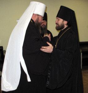 Greeting Metropolitan Jonah upon his arrival in Moscow were His Eminence, Archbishop Hilarion of Volokolamsk, Chairman of the Moscow Patriarchate’s Department of External Church Relations [DECR MP]; His Grace, Bishop Aleksandr of Dmitrov, Vicar to the Most Holy Patriarch of Moscow and All Russia; Archimandrite Zacchaeus, Representative of the Orthodox Church in America to the Moscow Patriarchate; Archpriest Nicholas Balashov, Deputy Chairman of the DECR MP; Priest Igor Yakimschuk, Acting Secretary for Inter-Church Relations; and other clergy and staff of the DECR MP.