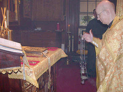 | While incensing the altar table he recites lines which confess the fullness of Christ’s presence, in the grave, in death, in paradise, at the right hand of the Father, “filling all things, Thyself uncircumscribed.” He also recites Psalm 51: “Have mercy on me, O God.” |